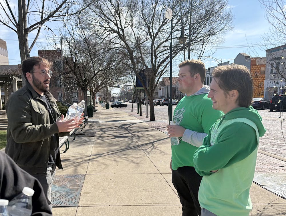 Students involved in campus ministries hand out free water to those celebrating Green Beer Day.