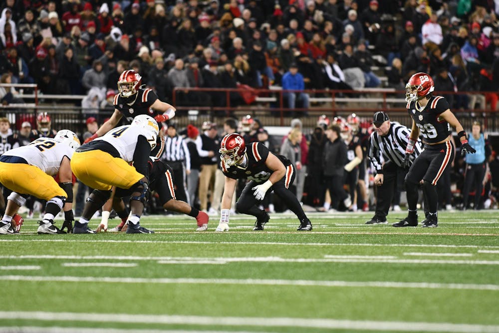 Miami's defensive line prepares for a Toledo snap at Yager Stadium on Nov. 12