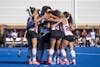 The Miami field hockey team celebrates after its win over Virginia in the Sweet Sixteen of the 2025 NCAA field hockey tournament