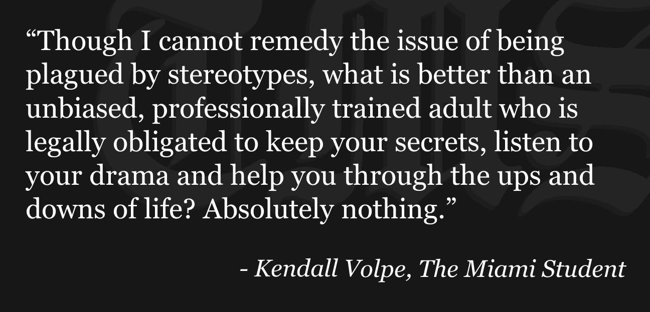 Though I cannot remedy the issue of being plagued by stereotypes, what is better than an unbiased, professionally trained adult who is legally obligated to keep your secrets, listen to your drama and help you through the ups and downs of life? Absolutely nothing.