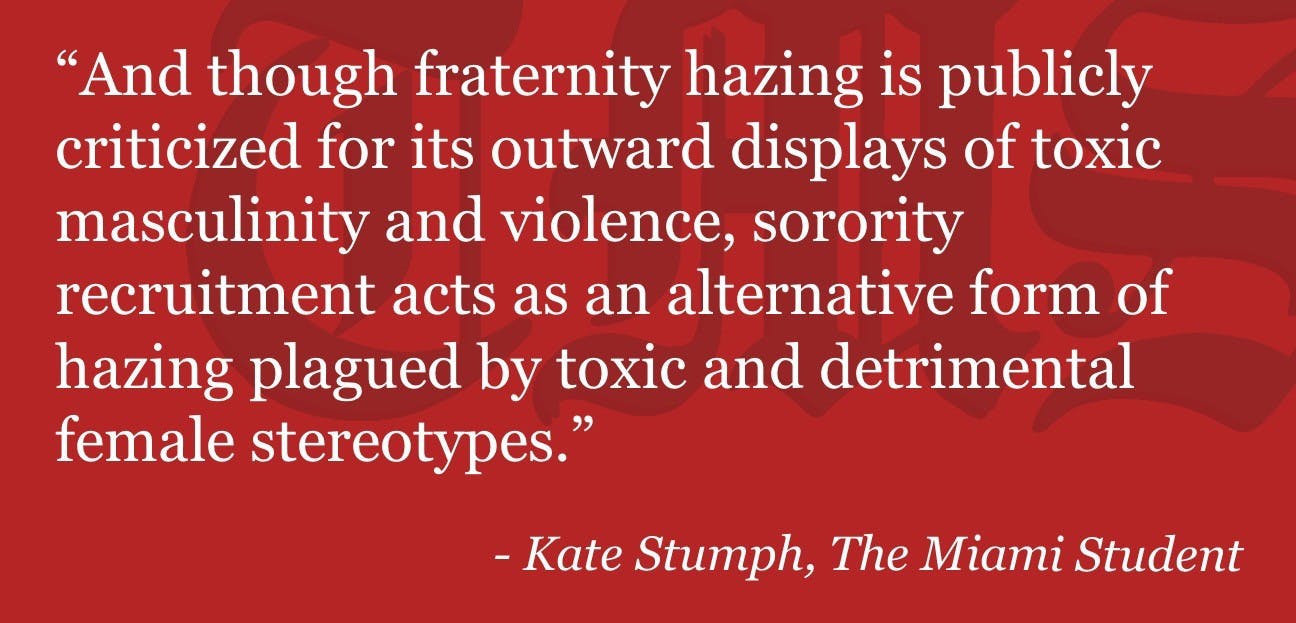 And though fraternity hazing is publicly criticized for its outward displays of toxic masculinity and violence, sorority recruitment acts as an alternative form of hazing plagued by toxic and detrimental female stereotypes.