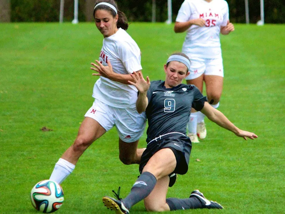 By Staff Writer | October 6, 2014Junior forward/midfielder Haley Walter attempts to dribble past a slide tackle from Toledo defender Kirsten Catloth. Walter has two goals and two assists on the season.